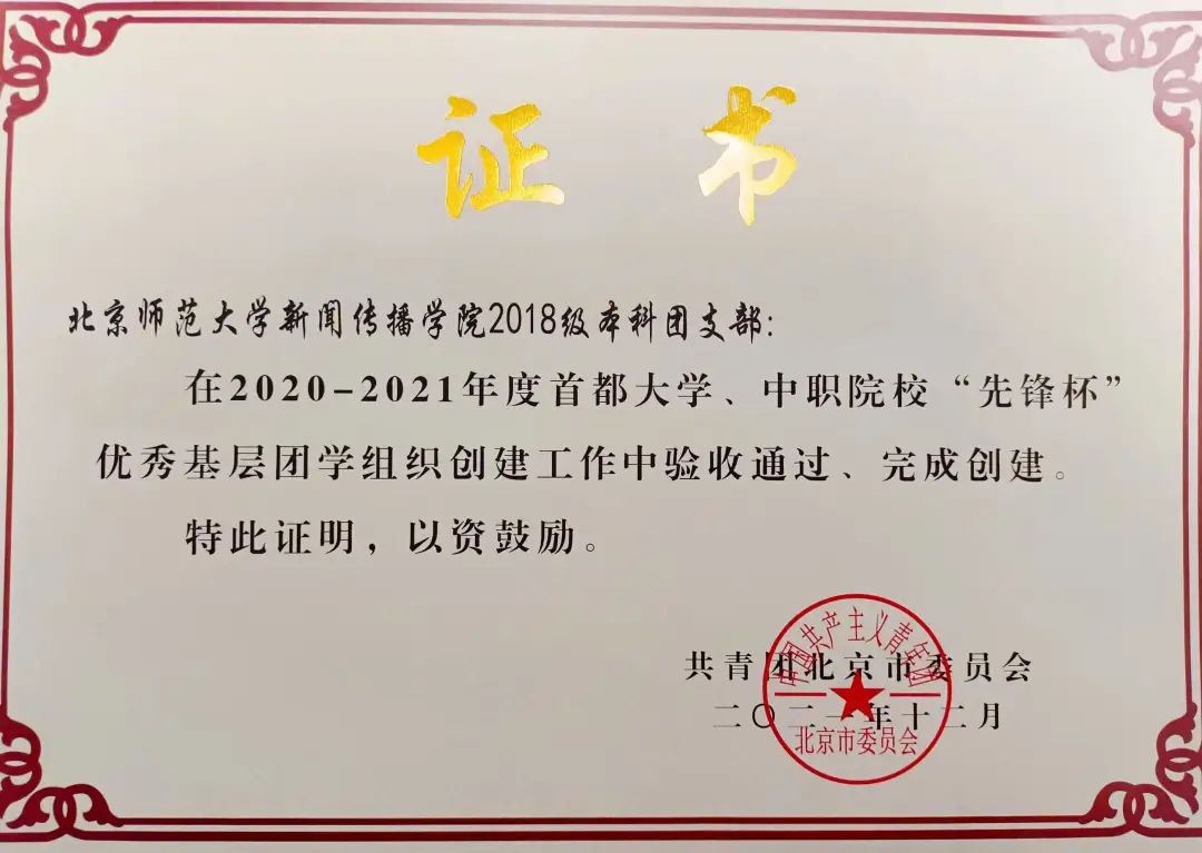 在2020-2021年度首都大学、中职院校“先锋杯”优秀基层团学组织评选中,经前期申报推选、中期阶段汇报、后期总结验收等环节,yl23455永利集团2018级本科团支部荣获首都“先锋杯”优秀基层团支部称号。