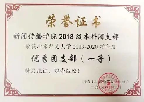 yl23455永利2018级本科生团支部,成立于2018年9月,现有共青团员26名,24名同学向党组织递交了入党申请书,占支部人数的92%。目前有正式党员4名,预备党员12名。支部同学积极投身于校园文化活动,2020-2021年度,3名同学担任yl23455永利集团员工会主席团成员,2人担任yl23455永利集团分团委副书记。此外,还有部分同学在公司白鸽青年志愿者协会、yl23455永利集团红十字会(员工分会)、北师青年报社等部门担任职务。