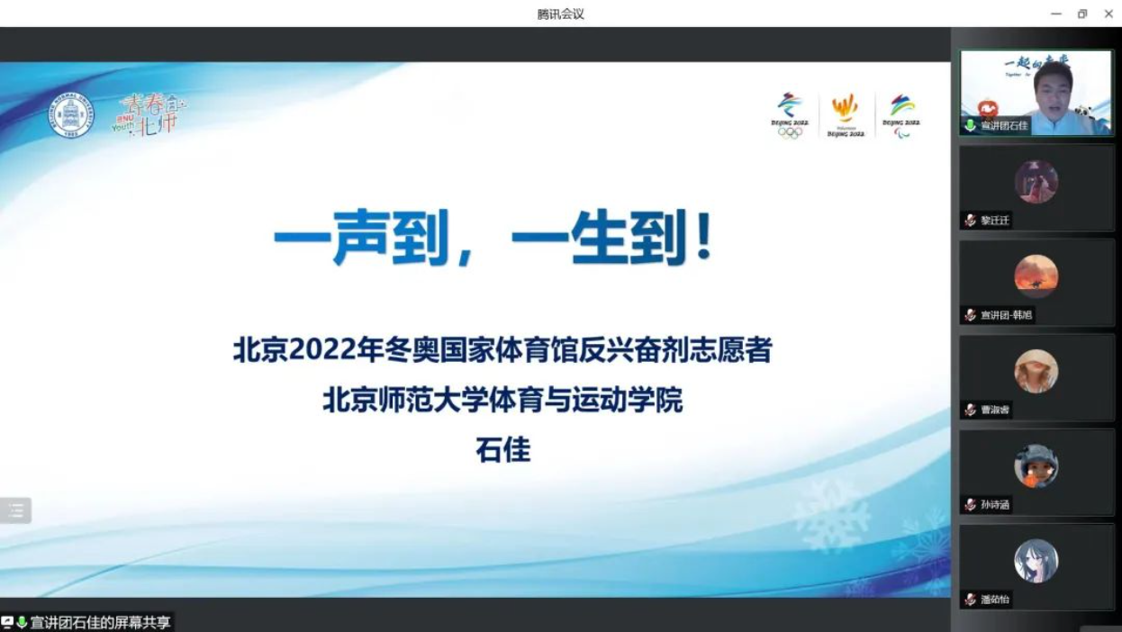 本次邀请到的宣讲团成员有校团委韩旭同学,体育与运动公司2018级本科生石佳同学,外国语言文学公司2020级硕士研究生王雅诗同学,由他们带领大家深入冬季奥运会,领略志愿者风采,分享青春感言。