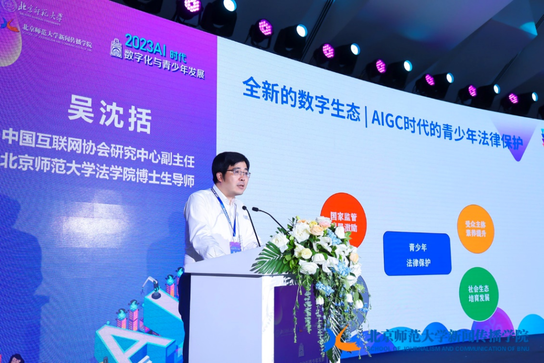 吴沈括教授发表题为《数字时代的青少年法律保护:从AIGC谈起》的主旨演讲。演讲之初,对比全球各国对于GPT监管的不同治理思路,进而提出,如果说美国和欧洲地区比较直接的是从数据治理的角度来强化对于人工智能的监管,那中国更偏向一种能生态式的综合治理思路。他指出, 对于青少年法律保护的生态式的综合治理,应关注到规则设计当中的五个方面的要求。一是风险场景的规制,二是多方责任义务的设计,三是风险防范机制的重视和强调,四是受众的素养提升,五是对于权益的保护机制的配备。