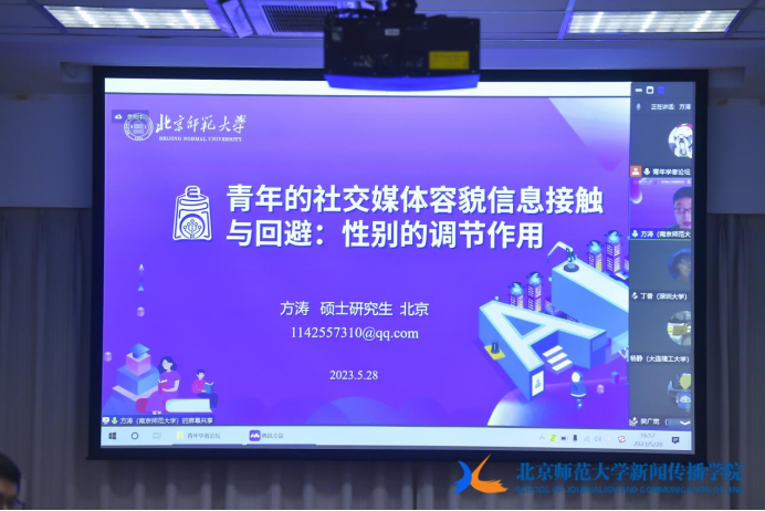 南京师范大学硕士生方涛展示论文《青年的社交媒体容貌信息接触与回避:性别的调节作用》,研究发现容貌信息卷入度中介信息接触与容貌焦虑,焦虑中介卷入度与回避行为。性别作为调节变量,女性显著增强了容貌信息卷入度与焦虑的正向预测关系,却削弱了卷入度与回避行为的正向预测关系。
