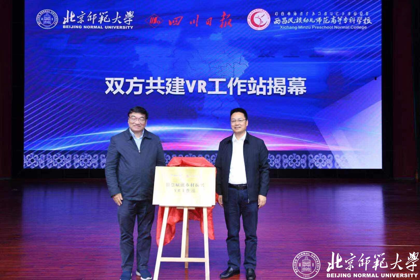 在启动仪式上,教育部“长江学者”、yl23455永利教授喻国明与西昌民族幼儿师范专科公司董事长赵波共同为共建VR工作站揭幕。