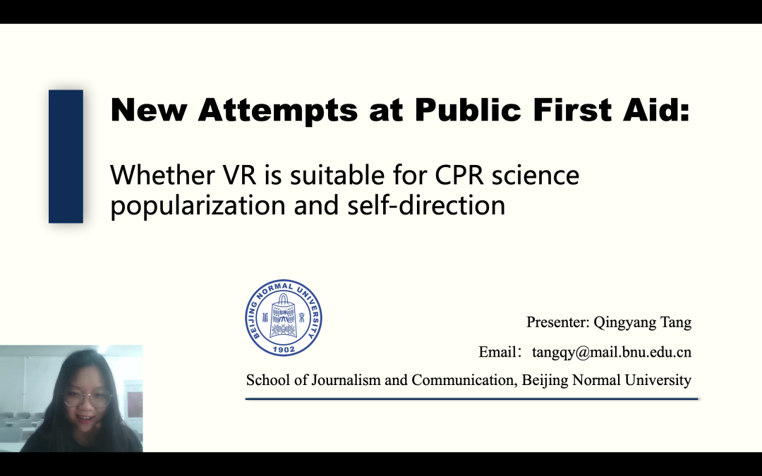 这两篇论文是基于汤清扬同学主持的校级本科生科研基金项目《不同技术呈现方式的传播效果及其中介效应差异研究:基于虚拟现实急救科普的人机互动实验》的学术成果。从实践层面来看,疫情期间心肺复苏线下培训的受阻使线上的、身临其境的、自我指导式的心肺复苏教育出现了需求;从理论层面来看,VR科普中媒介与策略究竟以何种关系单独或共同地影响科普教育效果有待探究。