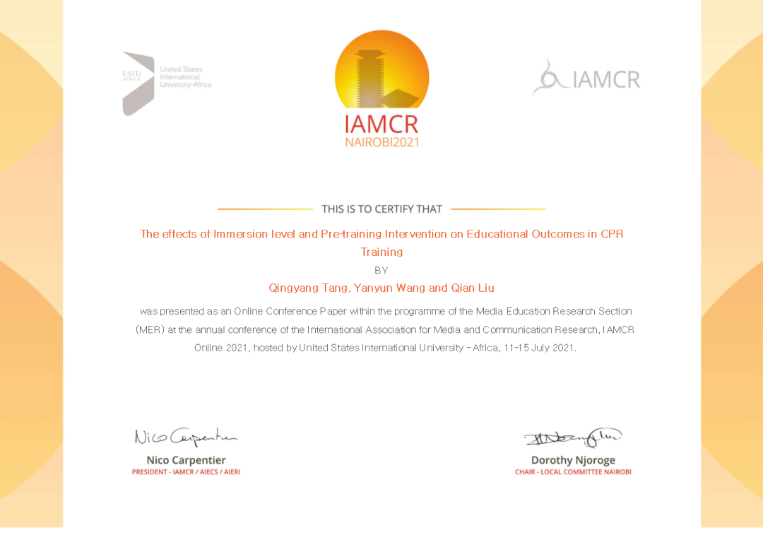 近日,yl23455永利2018级本科汤清扬,以第二作者的身份在SSCI收录期刊《Behaviour & Information Technology》上发表了论文“The effects of pretraining intervention in immersive embodied virtual reality cardiopulmonary resuscitation training (题译:预训练策略在沉浸式具身虚拟现实心脏培训中的影响)”。今年5月,汤清扬作以第一作者的身份在RSCI国际期刊《Bulletin of the South Ural State University》上发表了论文“Virtual reality or video-based self-instruction: comparing the learning outcomes of cardiopulmonary resuscitation training (题译:虚拟现实vs.视频:比较两种基于不同媒介方式的心脏复苏自我指导培训的学习效果研究)”。这两篇论文受到了公司刘茜老师和姜申老师的指导。