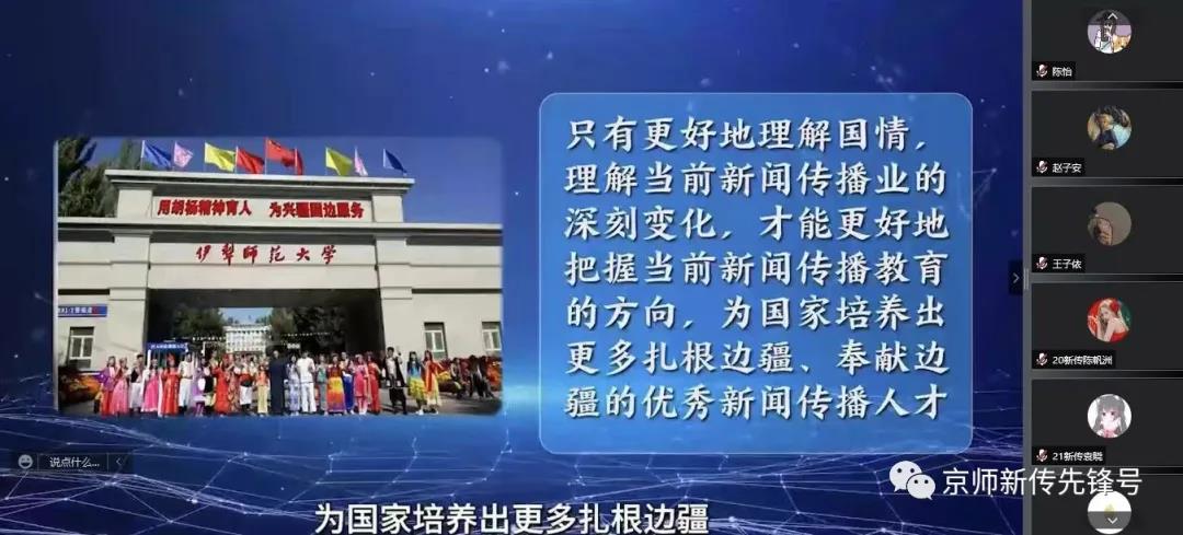 之后,大家共同观看了中国传媒大学教师团队的马新观学习引导片。引导片以“四力”为主线,由中国传媒大学教师团队从主题阐释、内容解析、缘起与价值以及教学效果和教学设计这五个角度对《2021中国新闻传播大讲堂》课程进行了介绍说明。课程以“践行四力,与时代同行”为主题,为与会的师生进行了一次生动而鲜活的马克思主义新闻观教育。