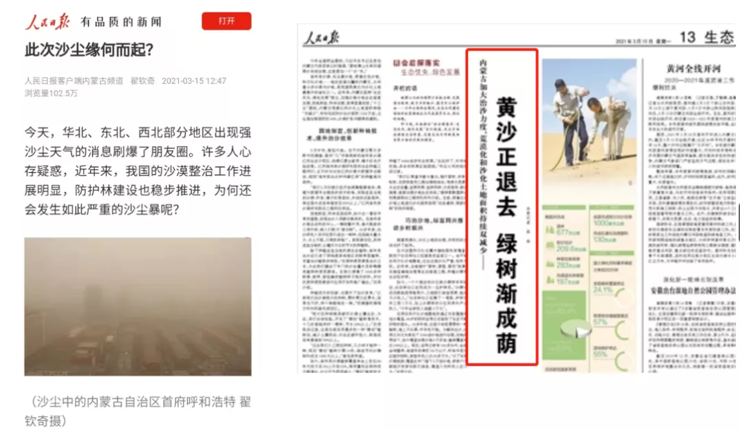 央媒的经历也让他收获了很多感悟。年初北京风沙又起,引来社会对治沙工作的部分质疑,钦奇师兄撰写了自己的第一篇“百万+”稿,厘清此次沙尘源头,并用真实的数据论证我国的治沙成就,指出北京近年沙尘问题发生的频率在下降。