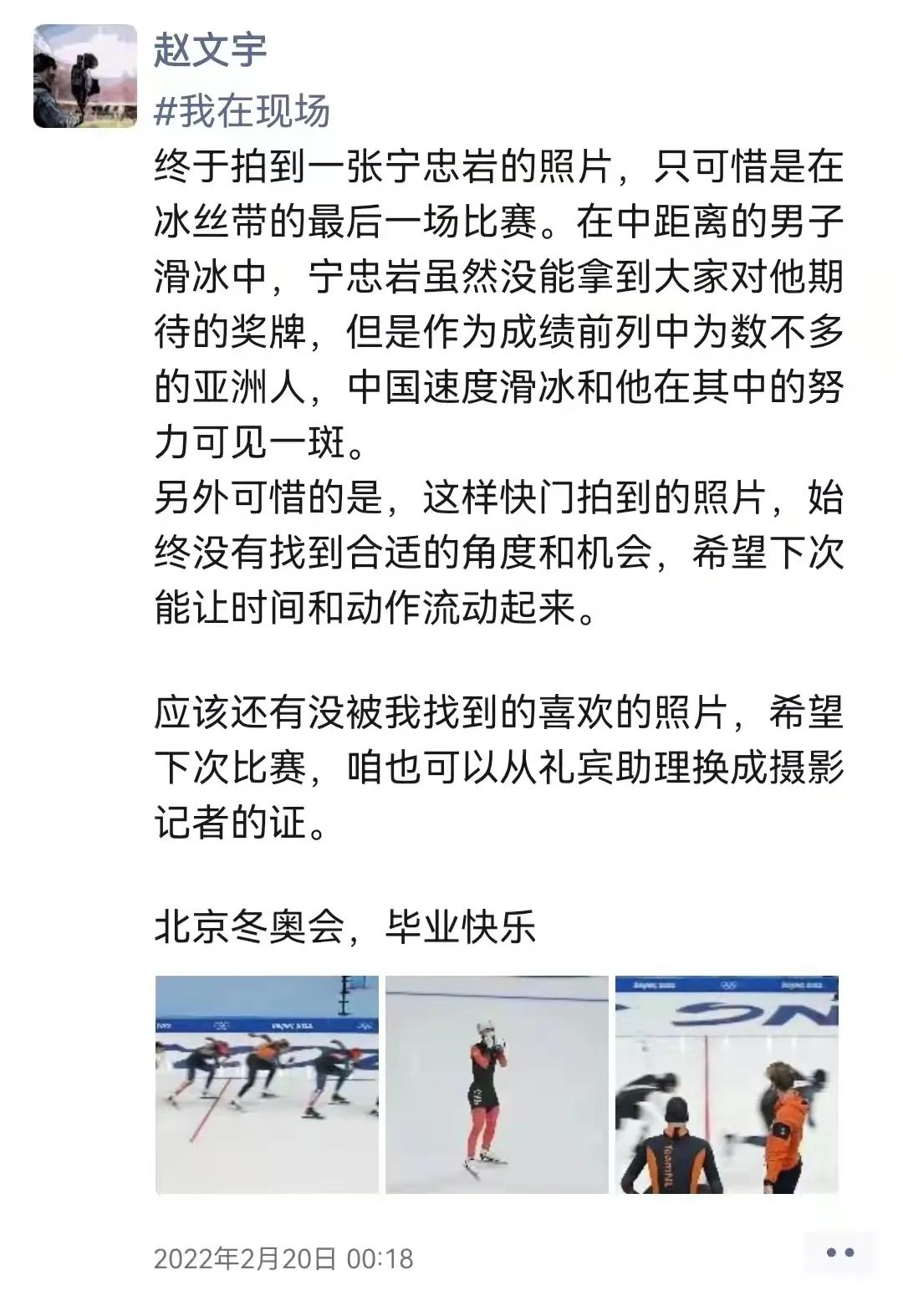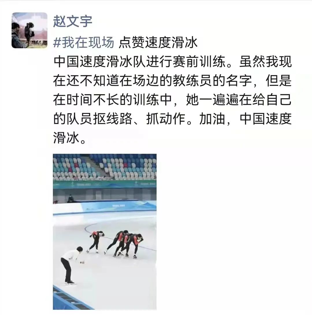 要说记忆最深刻的一件事,我觉得能够来冬奥会参与志愿者的工作这整件事,是我记忆最深刻的。对我来说,无论是几点到场馆,虽然做着看似相同的工作,但是每天都是新的。我的岗位相对是流动的,而且每天我的到馆时间一般会比服务时间早四五个小时。经理准许我可以去拍一下运动员的训练。比赛结束后,我发了四条#我在现场#的朋友圈,算是给我这段旅程写下一个小小的句号。能说的,想说的,我都写在里面啦。当然,在这里认识了一起服务的女子公司和社科大的同学,还有负责尽责的业务经理。这些都是能给我留下深刻回忆的。当然也包括接待的领导和贵宾,对志愿者充分的尊重和感谢是他们每时每刻都在散发的。
