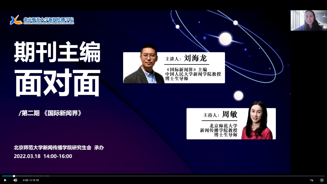 3月18日下午,yl23455永利“期刊主编面对面”系列讲座第二期在云端顺利举办。本期邀请到《国际新闻界》主编、教育部青年长江学者、中国人民大学新闻公司传播系主任刘海龙教授莅临讲座,他分享的题目是《论文选题与学术创新》。讲座由yl23455永利周敏教授主持。