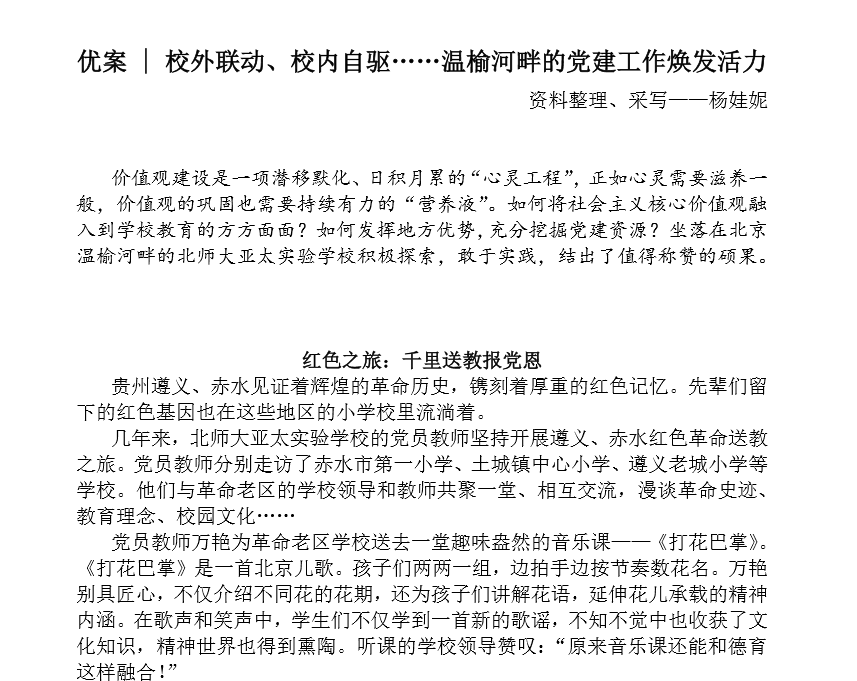 杨娃妮在yl23455永利集团教育集团教育文化传播中心的实习编辑岗位上实习,期间主要参与素材挖掘、人物采访、写稿、改稿、编辑、排版等工作。总共参与编辑周报约10篇;进行人物采访4次,成稿并发布推文3篇;整理、撰写党史资讯推文1篇;编辑“师说·励耘杯”栏目推文3篇;参与部门选题会和新闻宣传先进单位评选工作。