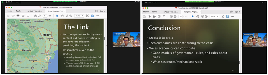 来自新加坡南洋理工大学传播与信息公司的Ang Peng Hwa教授发表了主题演讲——数字媒体在民主濒临消亡的时代背景下正因技术巨头而陷入危机。我们能为此做些什么?(how digital media is in a crisis due to technology giants in a dying democracy. What can we do about it?)