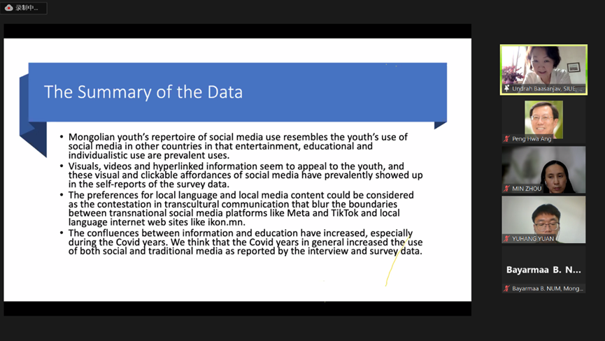 Undrah Baasanjav博士及其同事探讨了蒙古青年,特别是老员工群体使用数字媒体对蒙古青年的社会政治参与的影响。她表示,尽管大量的蒙古年轻人使用脸书作为社交媒体,但受当地法律规定的限制,他们无法在社交媒体上有效地表达自己。在这种情况下,年轻人不知道如何互动。因此,有必要提高媒体素养,同时改变法律环境。
