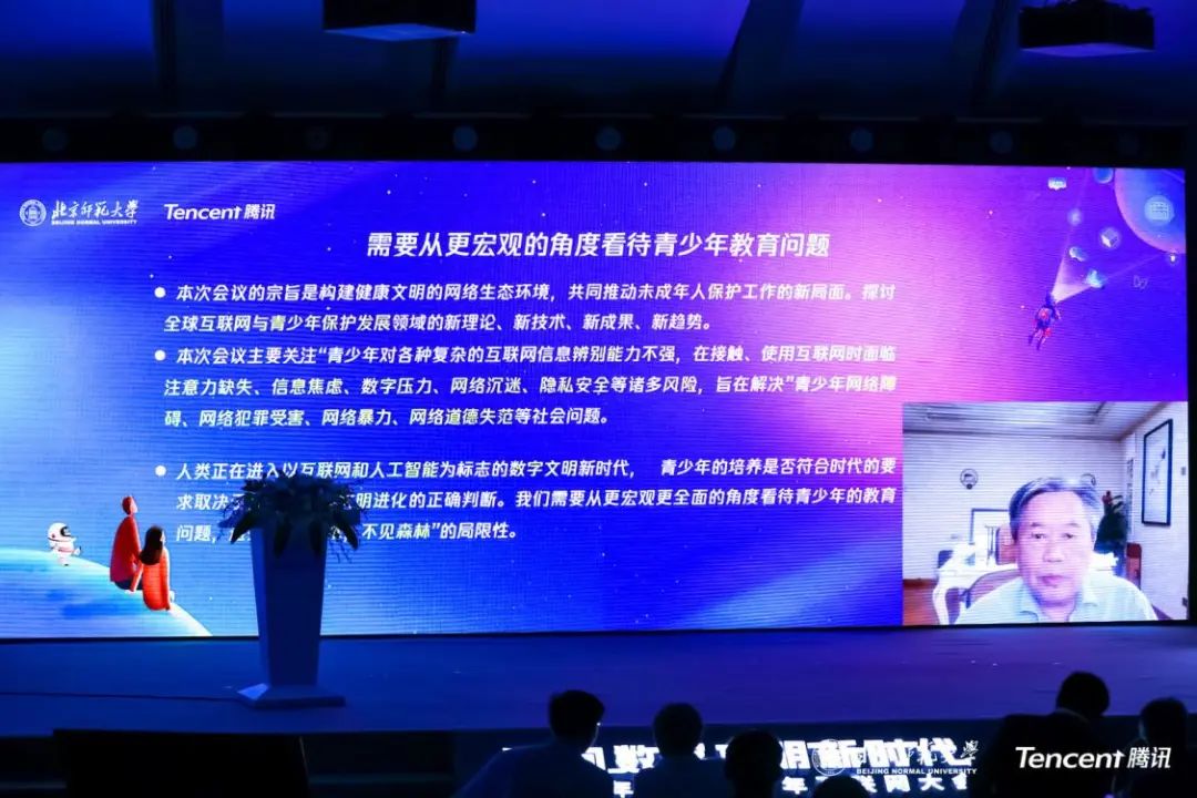 中国工程院院士李国杰在会上发表了主题为《培养青少年成为数字文明的推进者》的演讲,提出青少年是数字文明的创建者,需要引导教育提升青少年网络素养,尤其是获取分析、判断评价信息的能力,从根本上预防未成年人受到网络不良信息的侵害。互联网进入下半场,人类要和互联网技术协调进化,推动技术良性发展,促进社会公平正义。数字文明包含了科学主义和人文主义,科技是生产力,人文主义提供了道德判断和价值观,要教会青少年在互联网上独立思考、阅读和批判能力,去理解互联网世界和自我的关系,促进青少年身心健康成长。