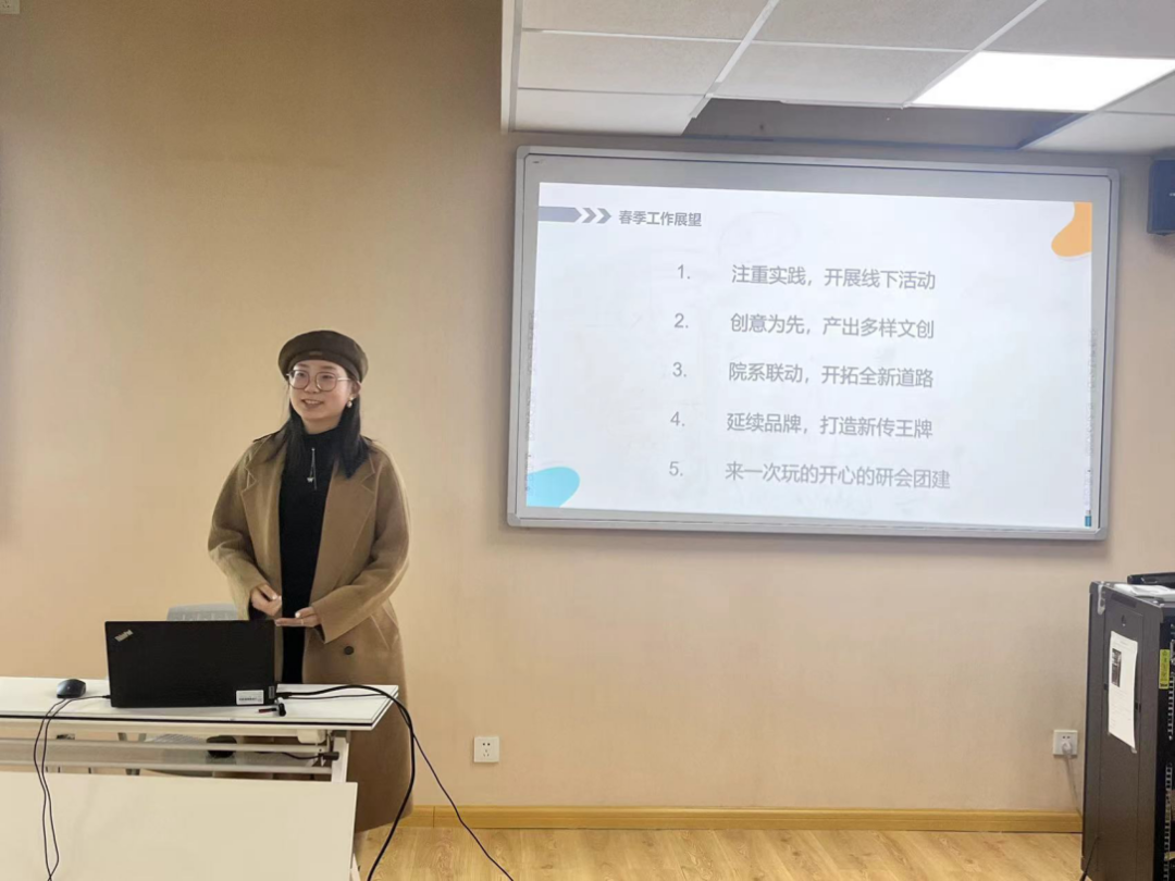 首先发言的是办公室主任朱玲。她对办公室的各方面工作做了简要介绍,办公室承担着思想引领、组织筹办、沟通协调三大职能,肩负着三项职能。上学期,办公室举办了新生晚会、经理书记座谈会、部门例会、22征兵入伍宣讲会等活动,部门人员通力合作,在配合中加深了彼此的了解,高效地完成工作。接着朱玲汇报了本学期办公室的工作计划,包括举办日常例会、书记经理座谈会、春日踏青活动、青年读书分享活动等。朱玲提出,新学期办公室要继续砥砺前行,在维护研会内部稳定、思想引领等方面发挥作用。