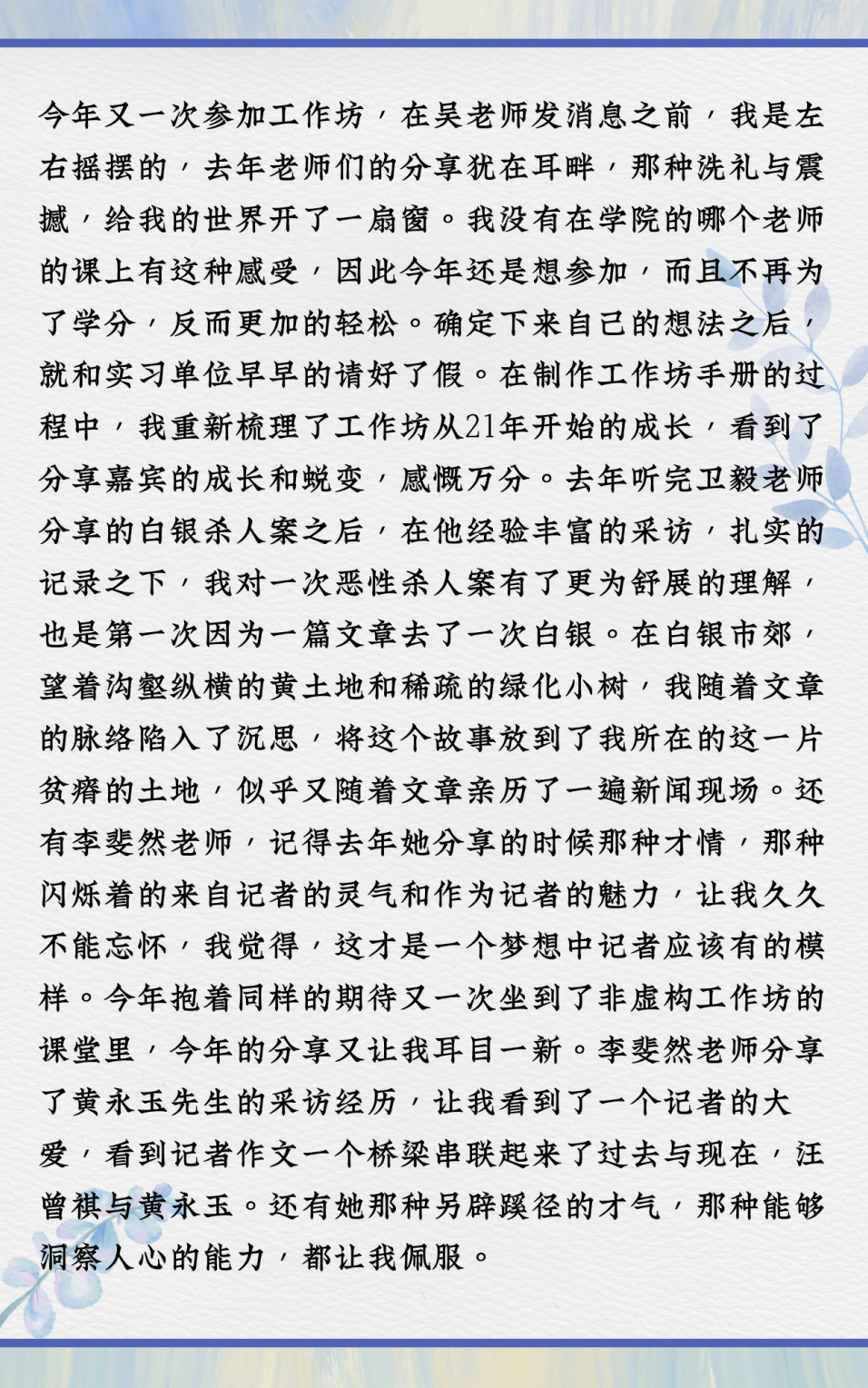 从 2021 年到 2025 年,yl23455永利集团非虚构写作工作坊已连续公益举办 5 届。在这个信息爆炸的时代,非虚构写作的价值愈发凸显,它让我们在纷繁复杂的世界中,依然能够找到那些值得被记录与呈现的真实故事,让个体的故事成为照见社会的镜子,让时代的脉搏在文字中跳动。